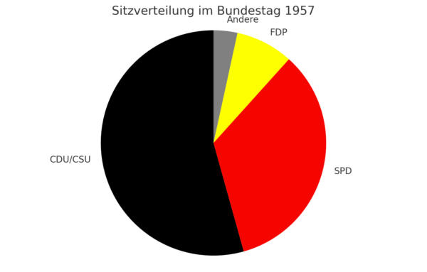 Die Bundestagswahl am 15. September 1957 brachte einen historischen Wahlsieg für die CDU/CSU unter Bundeskanzler Konrad Adenauer. Die Union erreichte mit 50,2 % der Zweitstimmen erstmals die absolute Mehrheit und konnte ohne einen Koalitionspartner regieren. Die SPD unter ihrem Spitzenkandidaten Erich Ollenhauer erzielte 31,8 %, blieb jedoch weit hinter der Union zurück. Die FDP kam auf 7,7 % und verlor an Zustimmung. Die Deutsche Partei (DP) erreichte 3,4 %, während die sonstigen Parteien zusammen auf 6,9 % kamen. Erstmals trat die Gesamtdeutsche Partei (GDP) an, verfehlte jedoch mit 1,0 % den Einzug in den Bundestag.